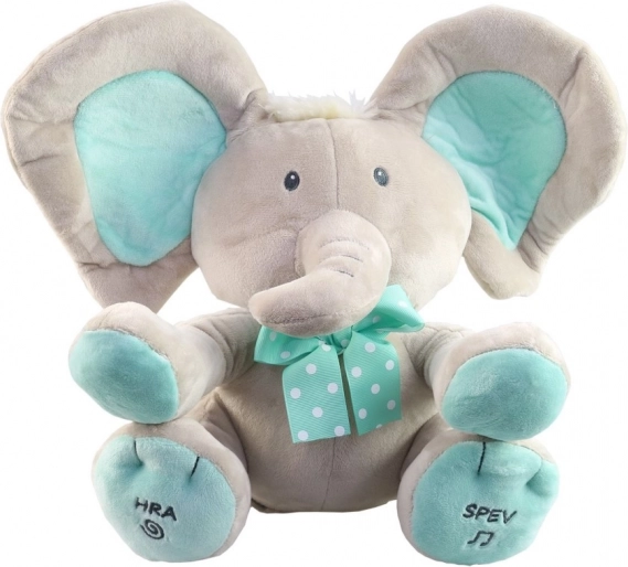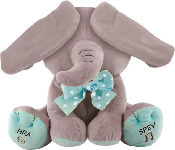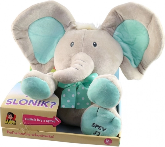 Schattig verstop-olifantje 25 cm, een interactieve knuffel die in het Slowaaks praat en zingt. Geschikt voor kinderen vanaf 12 maanden.