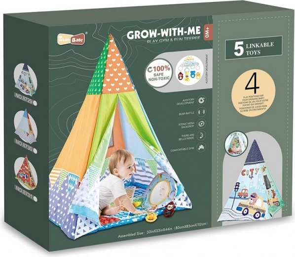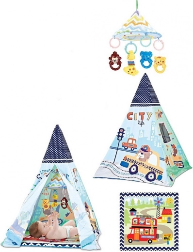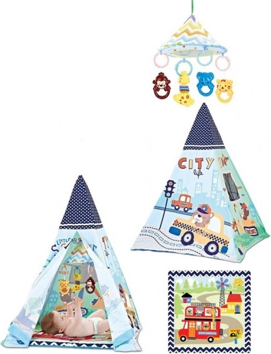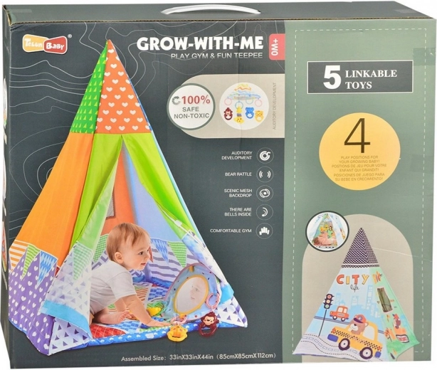 Deze speeltent is ideaal voor kinderen vanaf de geboorte. De set bevat veel speelgoed dat veilig is bevestigd met een clip. Speelgoed kan dankzij de universele clip eenvoudig aan een kinderwagen, ledikant of autostoeltje worden bevestigd; de clip kan tevens dienen als bijtring. De clips zijn ontworpen om kinderen te helpen hun grijpreflex te trainen. De tent is licht en gemakkelijk mee te nemen, zodat je overal kunt spelen.