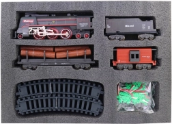 De speelervaring met deze treinset wordt versterkt door het damp-effect, dat uit de schoorsteen en het onderstel van de locomotief komt. De trein wordt geleverd met eenvoudig te monteren rails, waarmee u gemakkelijk een baan van 92,5 x 92 cm kunt opzetten.