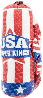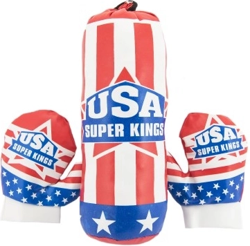 Leuke en veilige set voor kleine sporters: kinder-bokszak met handschoenen met het motief van de Amerikaanse vlag. Ideaal om energie kwijt te raken, coördinatie te ontwikkelen en spelenderwijs actief te zijn. Licht en compact, makkelijk mee te nemen en geschikt vanaf 3 jaar.