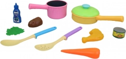 Deze keukenset is perfect voor kleine liefhebbers van koken. Met afmetingen van 28 x 20 cm is het ideaal voor kinderspel. Gemaakt van duurzaam plastic, garandeert veiligheid en lange levensduur. De verpakking is praktisch, geleverd in een zak met kaart, wat gemakkelijk opbergen mogelijk maakt.