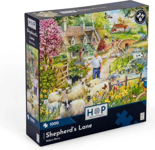Puzzel Herderssteeg 1000 stukjes van House of Puzzles met unieke vormen en A3-poster. Ideaal voor puzzelliefhebbers.