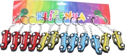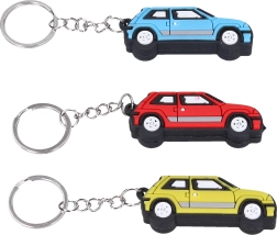 Stijlvolle sleutelhanger in de vorm van een auto, beschikbaar in drie levendige kleuren: rood, geel en blauw.