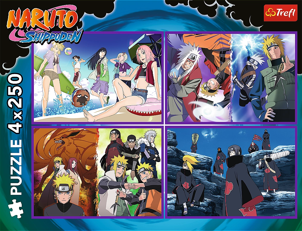 Beleef de fascinerende wereld van Naruto Shippuden met deze unieke puzzelset van het merk Trefl. Deze set bevat vier verschillende puzzels, elk met 250 stukjes, wat de perfecte manier is om je vrije tijd door te brengen.
