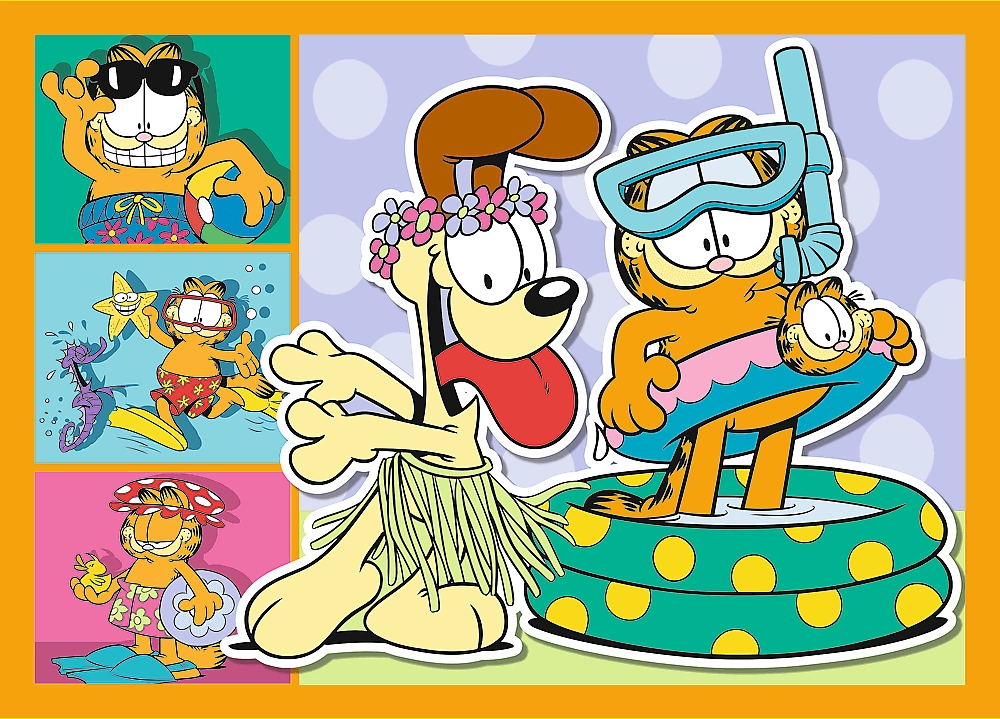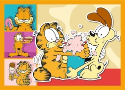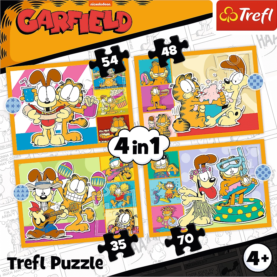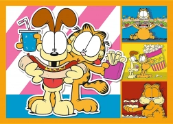 Progressieve puzzel met verschillende moeilijkheidsgraden, met vier afbeeldingen van Garfield. Elke puzzel bevat 35, 48, 54 of 70 stukjes en biedt plezier voor iedereen.