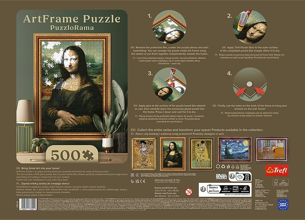 Ontdek een gloednieuwe kijk op puzzelen met de PuzzloRama-serie. Elke set bevat 500 stukjes die, eenmaal gelegd, een prachtige reproductie vormen van het beroemde meesterwerk Mona Lisa, geplaatst in een elegant frame. In de doos vind je alles wat je nodig hebt voor een ontspannende en tegelijkertijd creatieve ervaring.