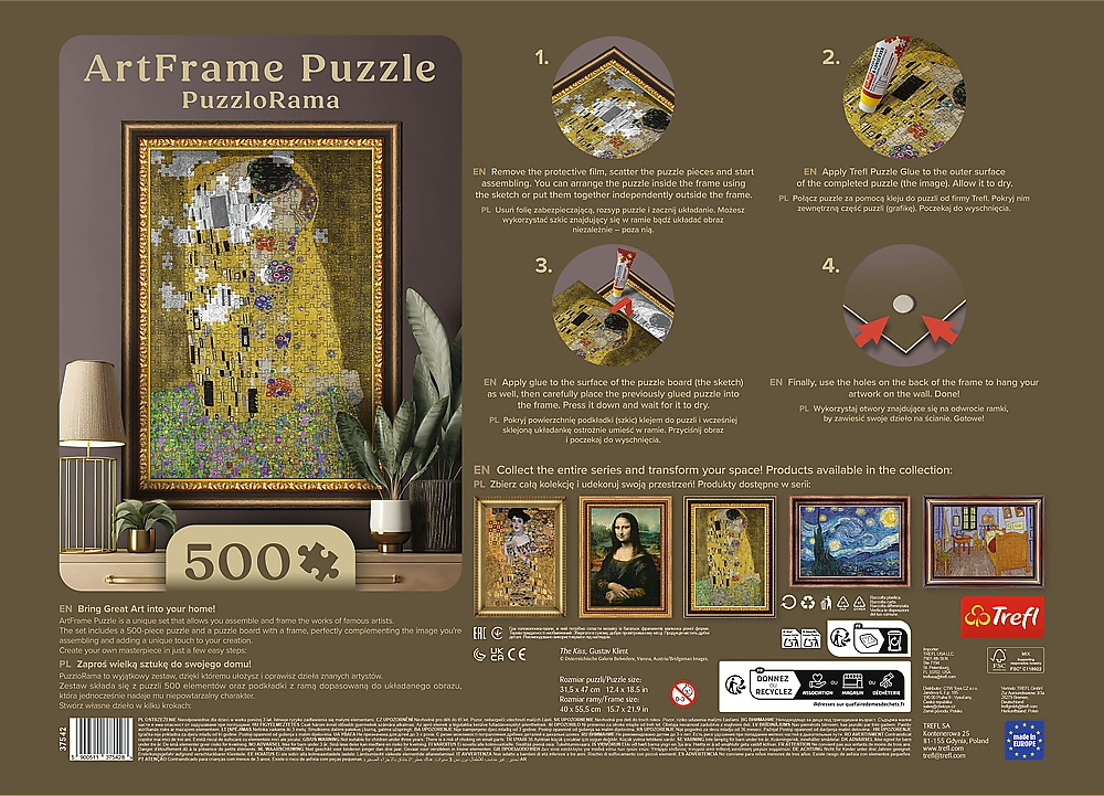 Duik in de wereld van kunst met een puzzel waarmee je een schitterende reproductie van een beroemd schilderij kunt maken. Elke set bevat: