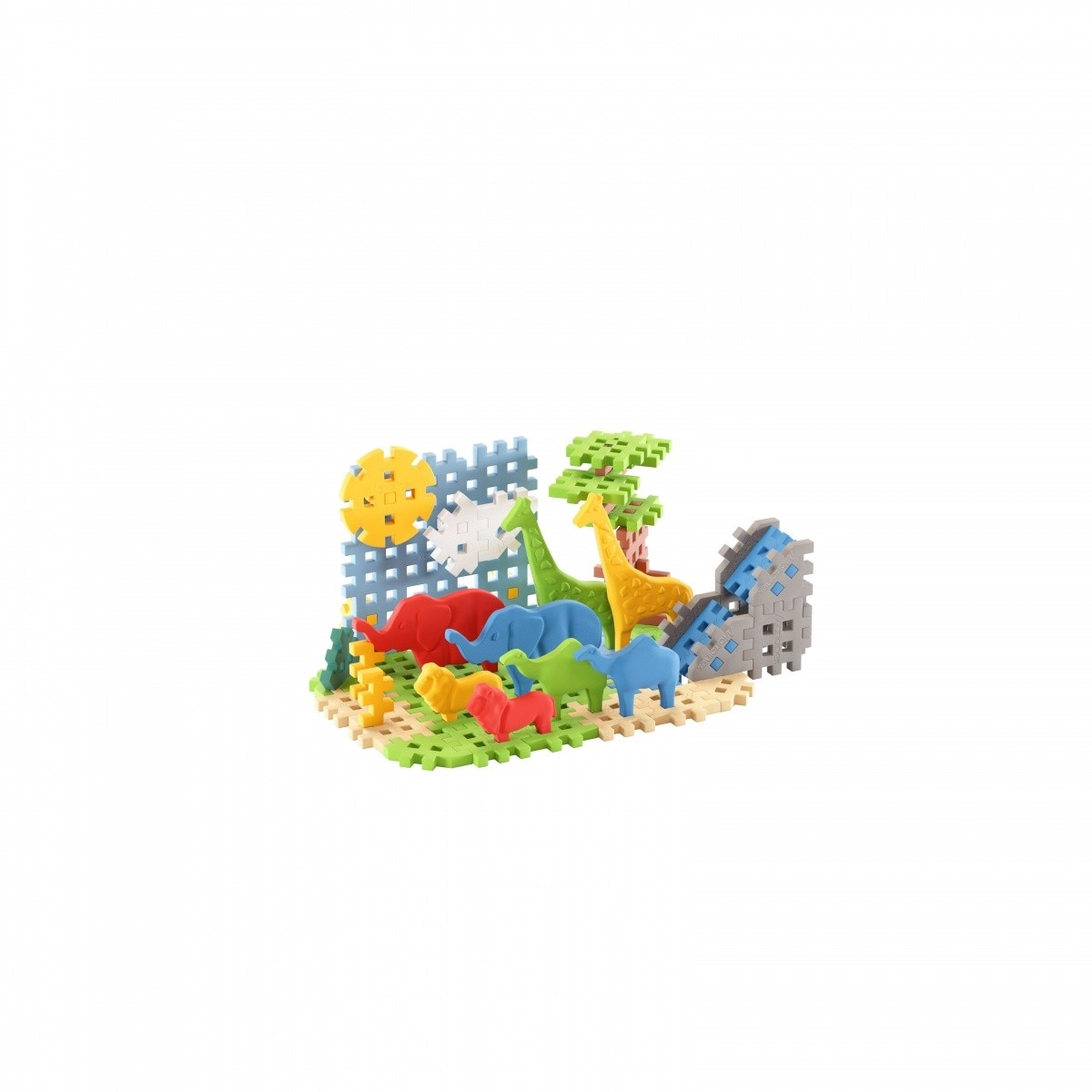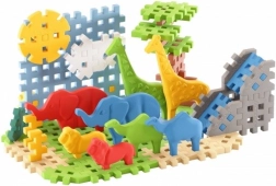 Met de bouwset Mini Waffle - Savanne Dieren kunnen kinderen hun eigen fantastische wereld vol Afrikaans leven creëren. De set bevat 50 onderdelen in verschillende vormen, waarmee je scèneelementen kunt bouwen, zoals een schilderachtige waterval en een indrukwekkende savanne-achtergrond. Er is ook een leeuwenfamilie in de zon, olifanten bij de drinkplaats en giraffen in de verte.