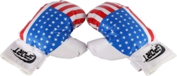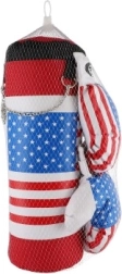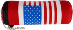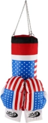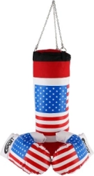 De bokszak en handschoenen zijn ontworpen met een motief van de Amerikaanse vlag, wat een speelse en kleurrijke uitstraling geeft.