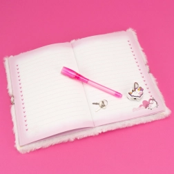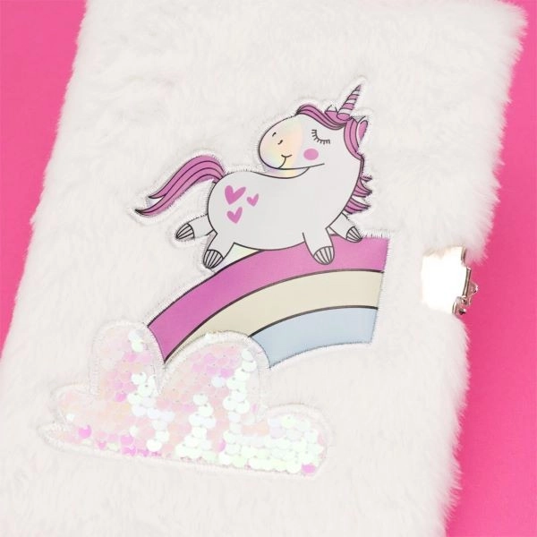 Het boek heeft een extra zachte, pluche omslag, versierd met een iriserende eenhoorn en parelmoeren omkeerbare pailletten. Deze unieke look is ideaal voor wie van magische en kleurrijke accessoires houdt.
