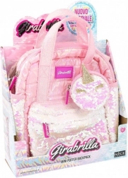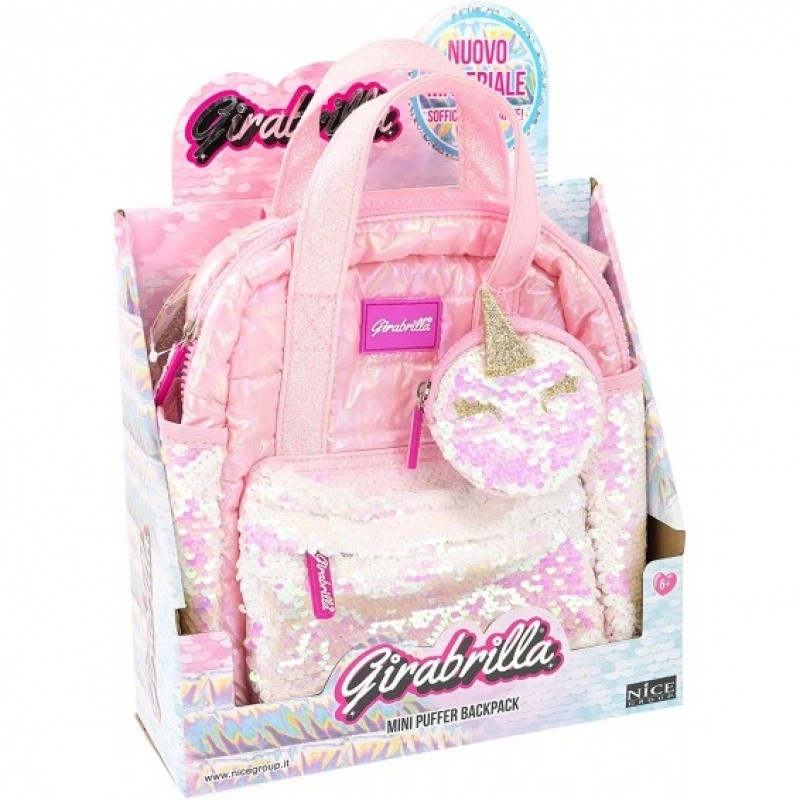 Stijlvolle roze mini rugzak gemaakt van zachte, opaalachtig stof bevat kleurrijke pailletten zakken en een unieke portemonnee in de vorm van een eenhoorn.