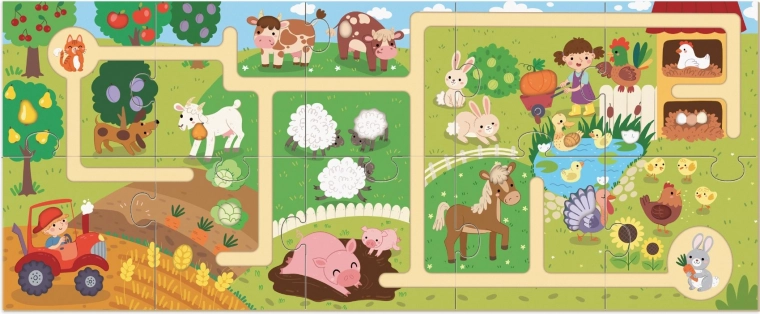 DODO Puzzel Doolhof Mijn Boerderij trekt kinderen aan met zijn kleurrijke illustratie van het boerenleven – van tractoren en tuinen tot schattige dieren zoals koeien, varkentjes, konijntjes, schaapjes, kuikentjes en eendjes. Kinderen leren op een speelse manier de boerderij en haar bewoners kennen.