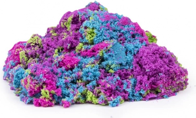 In de verpakking vind je blauw, groen, paars en roze. Je kunt de kleuren in lagen opbouwen tot bonte kastelen en ze daarna weer door elkaar mengen – elke keer ontstaan nieuwe combinaties.
