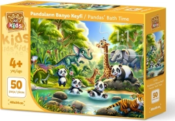 Puzzel Panda-bad biedt plezier voor het hele gezin met 50 goed passende stukjes die samen een prachtige afbeelding vormen van een panda in bad.