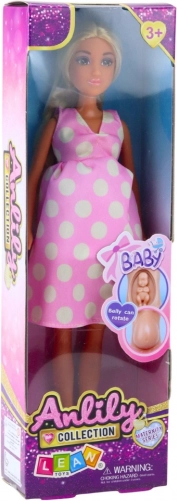 De zwangere pop Anlily biedt een realistische en leerzame ervaring voor kinderen. De afneembare buik met een klein baby’tje binnenin voegt extra realisme toe aan het spel, ondersteunt emotionele ontwikkeling en leert empathie en zorgzaamheid. De pop is ongeveer 30 cm groot, heeft lang blond haar, subtiele make-up en beweegbare ledematen.