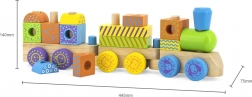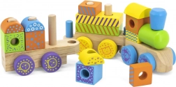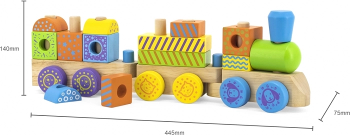 Deze kwalitatieve houten trein bestaat uit meerdere wagonnetjes met pinnetjes waarop kinderen bonte geometrische blokken stapelen. Hij combineert stapelen, trekken en bouwen, prikkelt de verbeelding en traint oog-handcoördinatie. Zorgvuldig afgewerkt hout en niet-giftige kleuren garanderen veiligheid en duurzaamheid bij dagelijks spel.