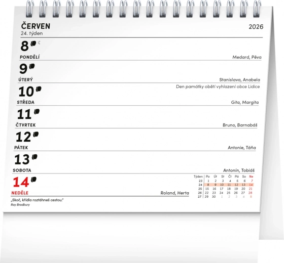Praktische bureaublad kalender 2026 met citaten, sterrenbeelden en Tsjechische feestdagen in compact formaat.