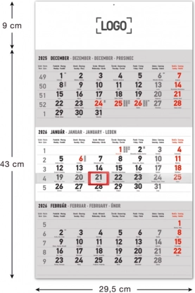 Praktische wandkalender voor 2026 met een driemaandsoverzicht, ideaal voor planning thuis en op kantoor. Voorzien van een driemaandse indeling, een oriëntatielijst met verschuifbare marker voor snelle oriëntatie en een kalendarium met Slowaakse namen en wereldwijde feestdagen op een elegant grijze achtergrond.