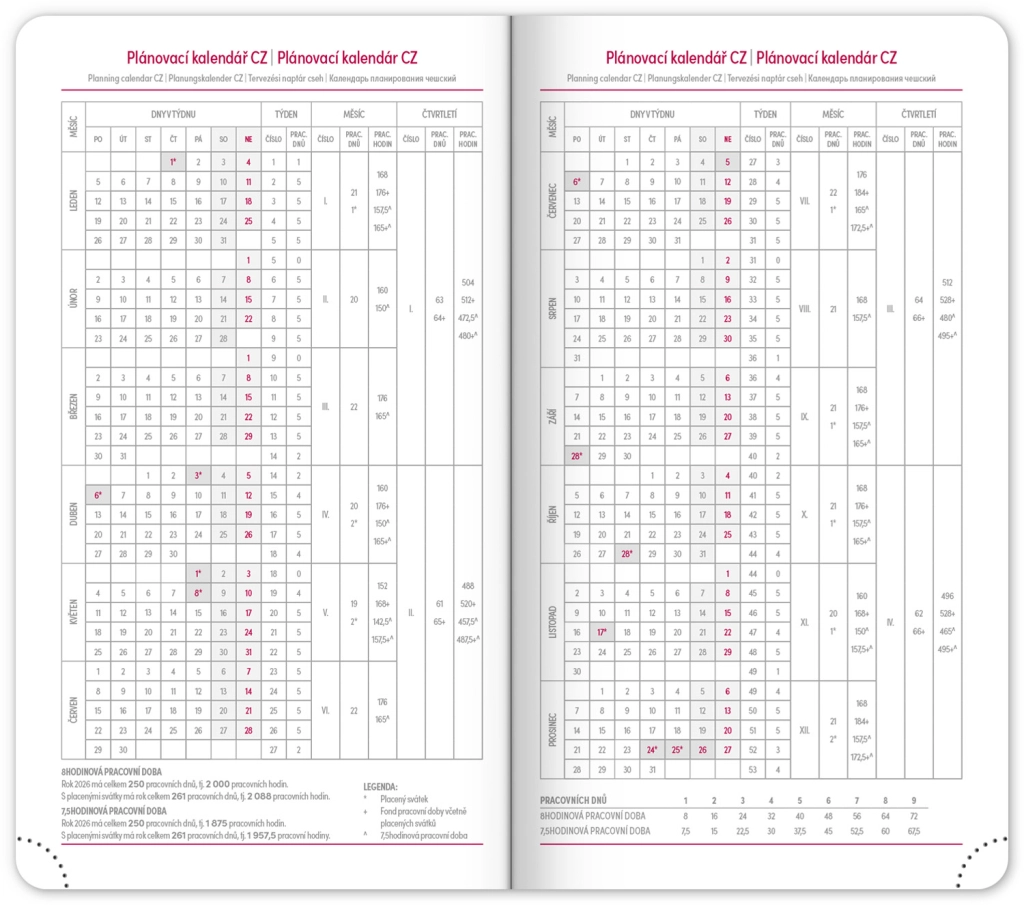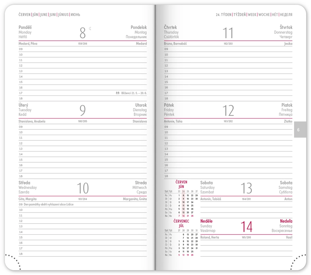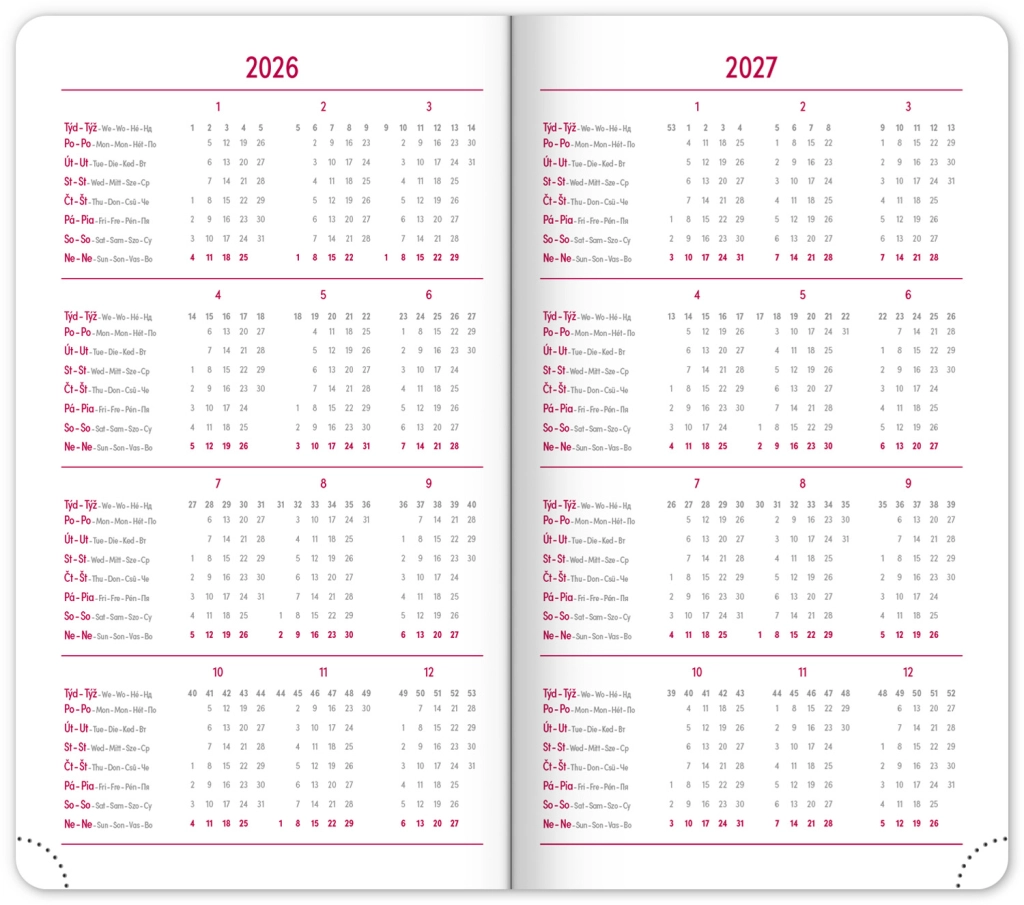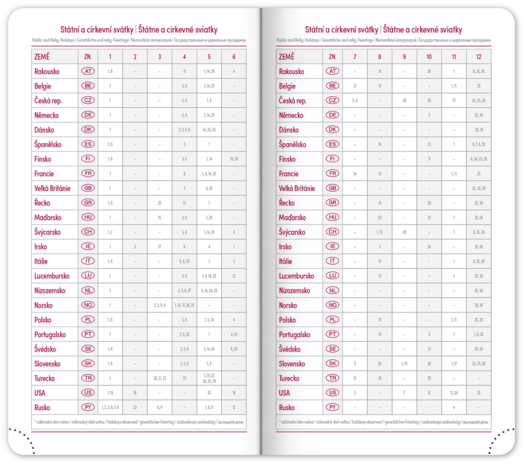 - Wekelijkse planning met Tsjechische en Slowaakse kalender, aangevuld met Engels, Duits, Hongaars en Russisch