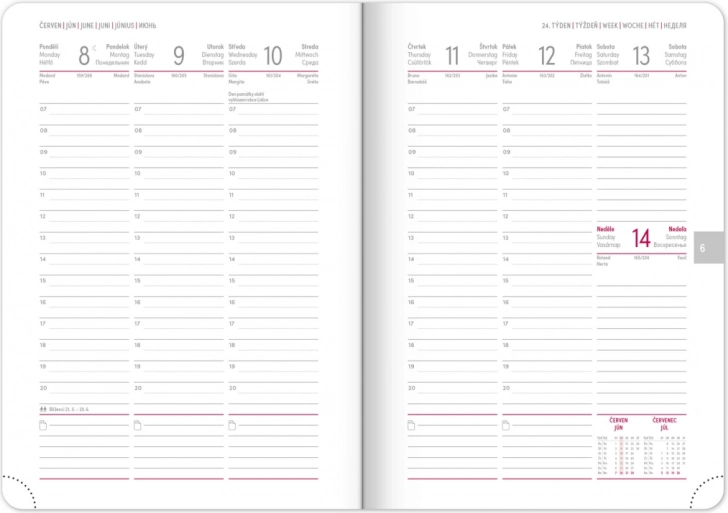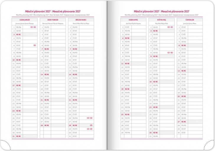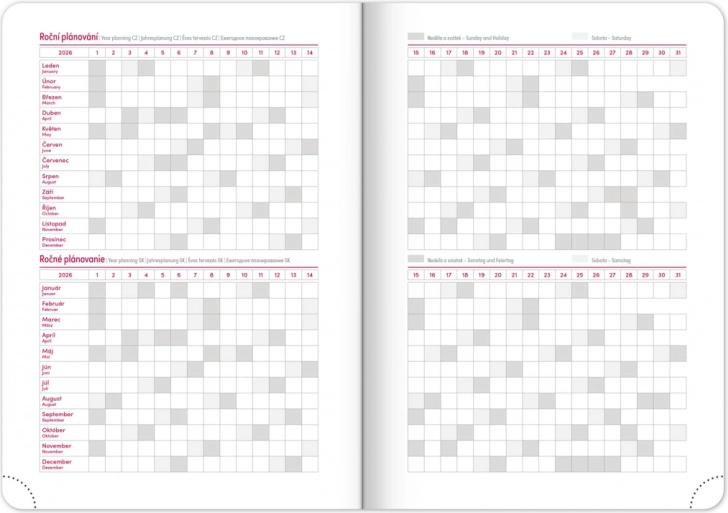 De weekagenda Ajax 2026 is de ideale oplossing voor wie een precieze planning vereist. Hij bevat een weekindeling met een Tsjechisch-Slowaakse kalender en aanvullende talen zoals Engels, Duits, Hongaars en Russisch. Dankzij de uitvoering met een elastische sluitband en textiele bladwijzer is hij gemakkelijk mee te nemen en klaar voor dagelijks gebruik.