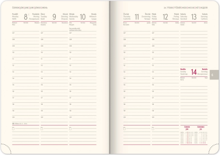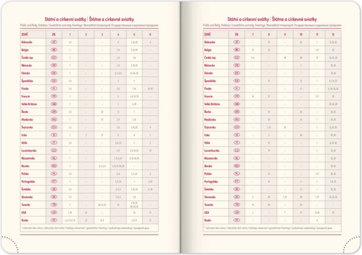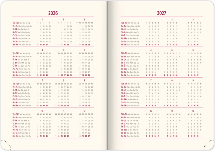 - Weekindeling met een Tsjechisch-Slowaakse kalender en andere talen.