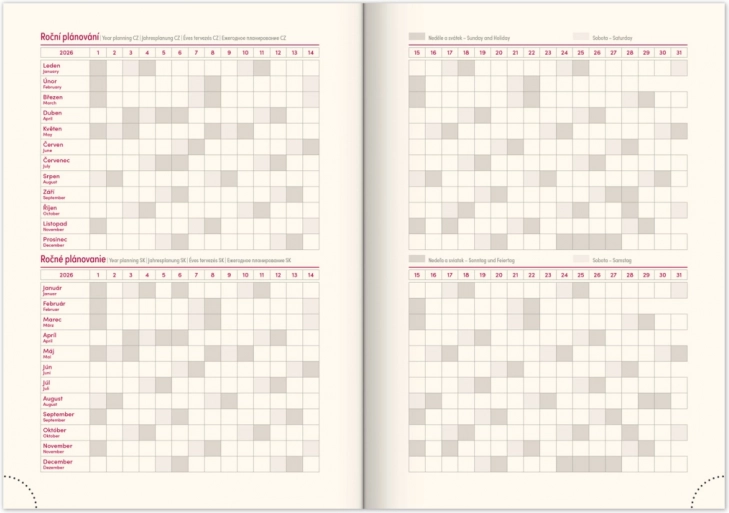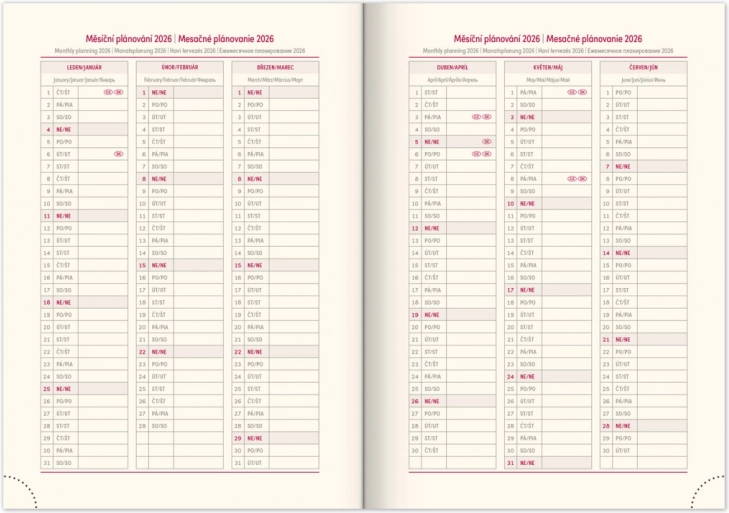 Notique Panama weekagenda 2026 in een rode uitvoering is de ideale partner voor het plannen van je tijd. Met een subtiele oppervlaktetextuur, geschikt voor alle soorten blinddruk, en voorzien van een Tsjechisch-Slowaaks kalendarium met aanvullende talen.