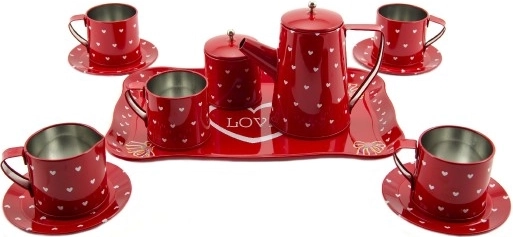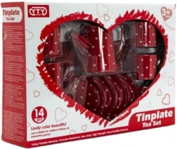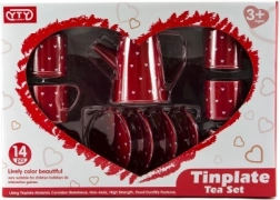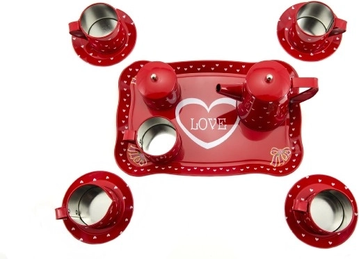 Het rode servies is versierd met witte hartjes, wat een romantische en tegelijkertijd speelse uitstraling geeft. Elk stuk is zorgvuldig op elkaar afgestemd om een harmonisch geheel te vormen dat de kinderlijke fantasie stimuleert.