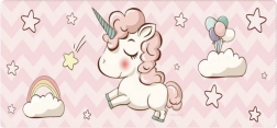 De mat is gemaakt van zacht maar duurzaam rubber, dat zorgt voor een stabiele grip op het tafeloppervlak en verschuiven voorkomt. De toplaag is prettig aan te raken en slijtvast. Het roze design met eenhoorns, wolken en sterretjes brengt een sprookjesachtige sfeer en geeft de ruimte meer leven.