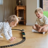 In de verpakking zitten een passagiersrijtuig, kolenwagon en goederenwagon voor talloze scenario’s, van het vervoeren van reizigers tot goederen. De lichte, veilige constructie is ideaal voor binnenspelen en stimuleert creativiteit, verbeeldingskracht en logisch denken.