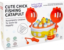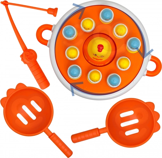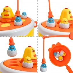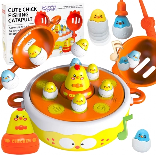 Deze veelzijdige speelgoedset combineert vier spellen in één, waardoor kinderen lang speelplezier hebben. De roterende basis met muziek laat kuikentjes willekeurig omhoog komen, die je met de magnetische hengel kunt vangen of met de schepjes kunt opvangen nadat ze met de katapult zijn gelanceerd. Het grotere afneembare kuiken kan als speels autootje worden gebruikt.