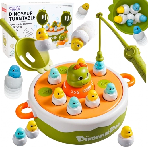 Ga samen met de kinderen terug naar de prehistorie met dit interactieve spel van het merk WOOPIE. Deze veelzijdige 4-in-1 set combineert magnetisch hengelspel, een leuk katapultspel, een mini dino–autootje en op de achterkant van de basis ook boter-kaas-en-eieren. De kleurrijke dino-kuikentjes in “schelpjes” en het vaardig hanteren van hengels en schepjes stimuleren fijne motoriek, coördinatievaardigheden en samen spel voor twee.