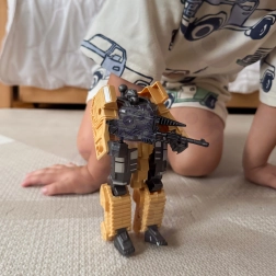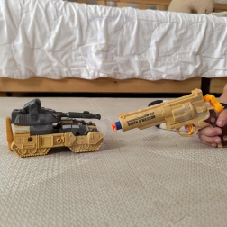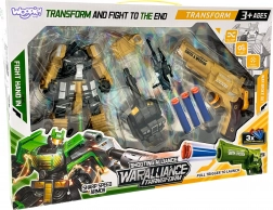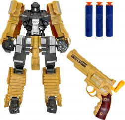Inhoud van de set: 1× transformerende robot/tank, 1× pistool (revolver), 3× foam pijltje, aanvullende gevechtsaccessoires.