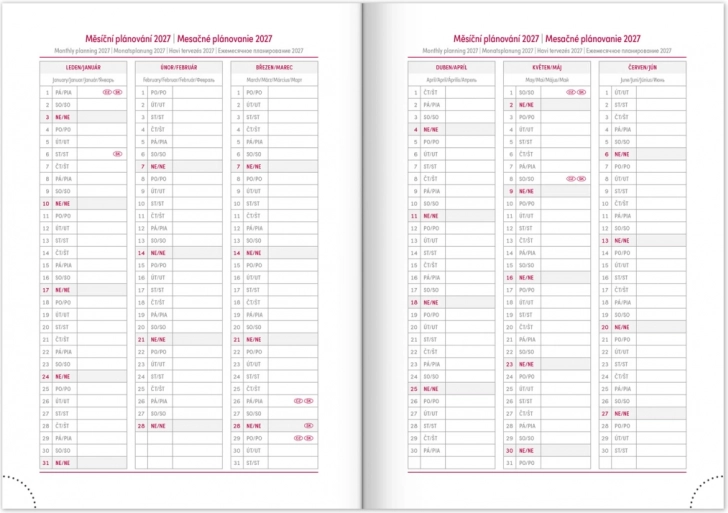 - Wekelijkse indeling met een Tsjechisch-Slowaakse kalender en aanvullende versies in het Engels, Duits, Hongaars en Russisch.