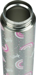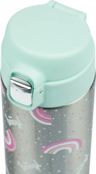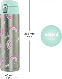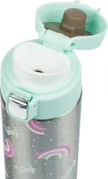 Geniet van stijl en functionaliteit met deze thermosfles, die eenvoudig openen en een geïntegreerd siliconen drinktuitje biedt. Met een inhoud van 450 ml is hij perfect voor dagelijks gebruik. De fles is verkrijgbaar in meerdere speelse designs die je gemakkelijk kunt matchen met de rest van de schooluitrusting.