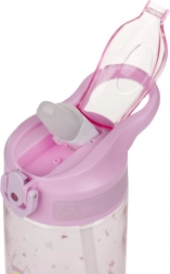 De fles is uitgerust met een praktische uitklapbare drinktuit en een rietje, waardoor drinken voor jongere kinderen makkelijker wordt.