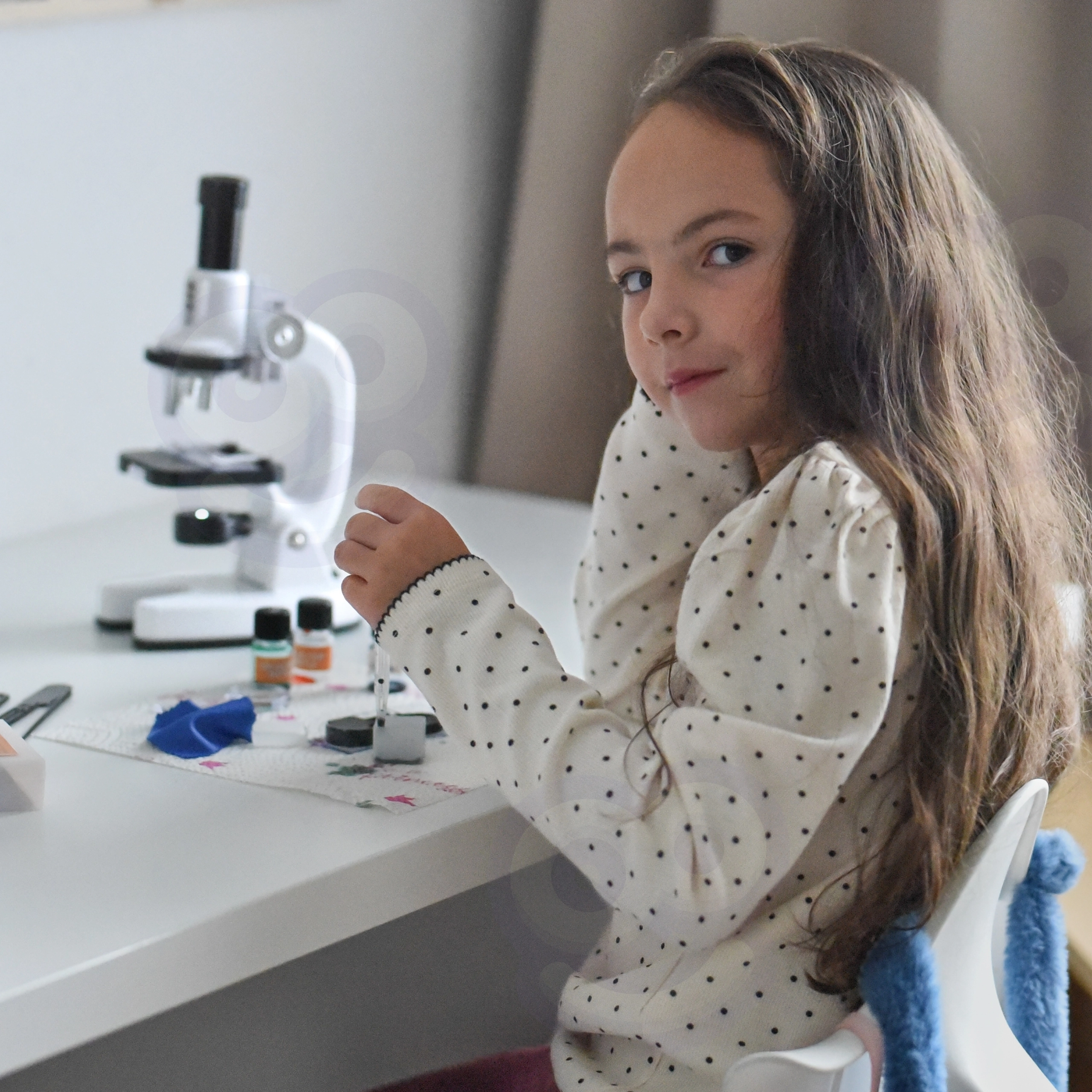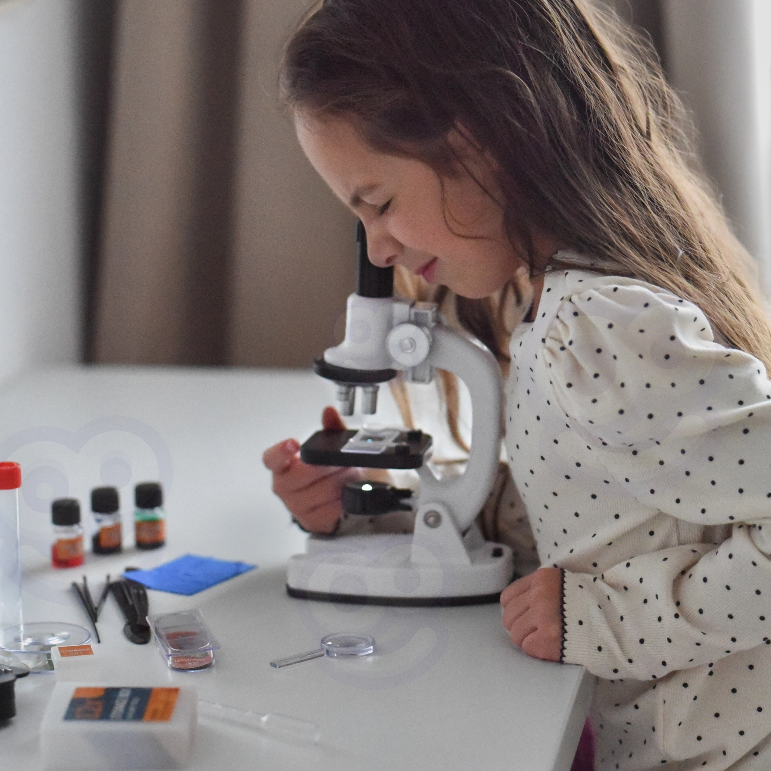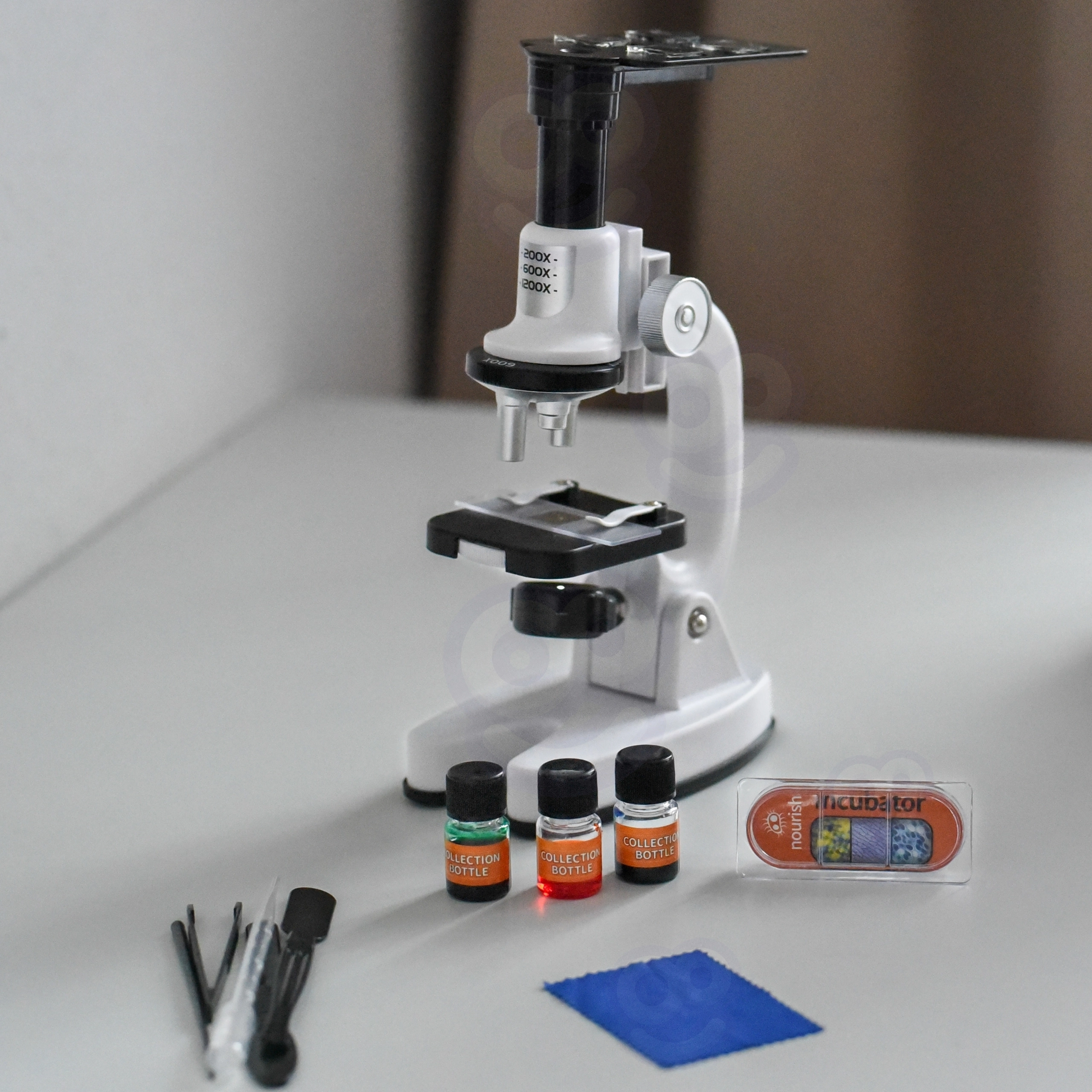 Objectglaasjes, dekglaasjes, flesjes, pincet, pipet, gereedschap en opbergdoos – alles wat kinderen nodig hebben om preparaten te maken en te bekijken.