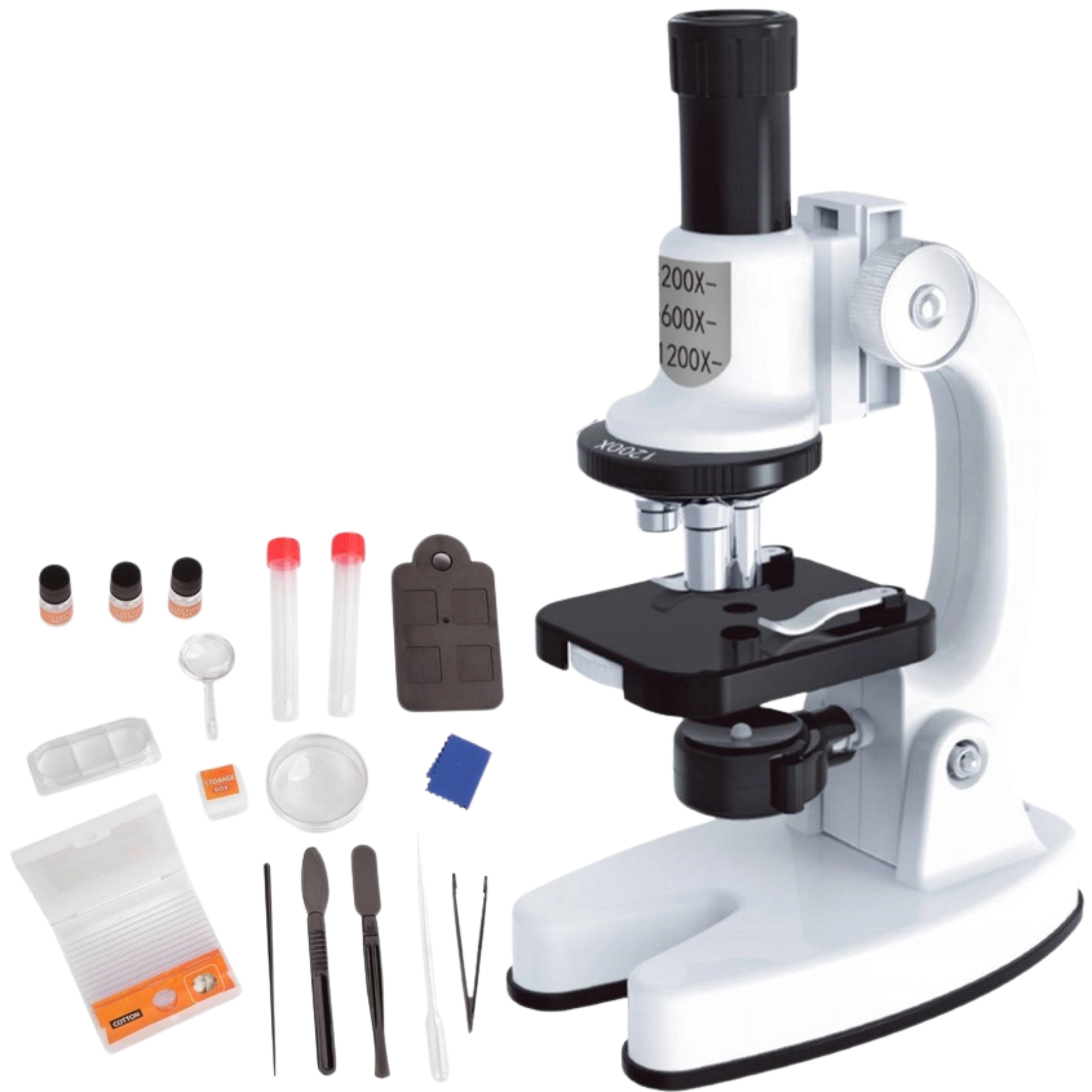 - Microscoop met drievoudige vergroting en draaibare kleurfilter.