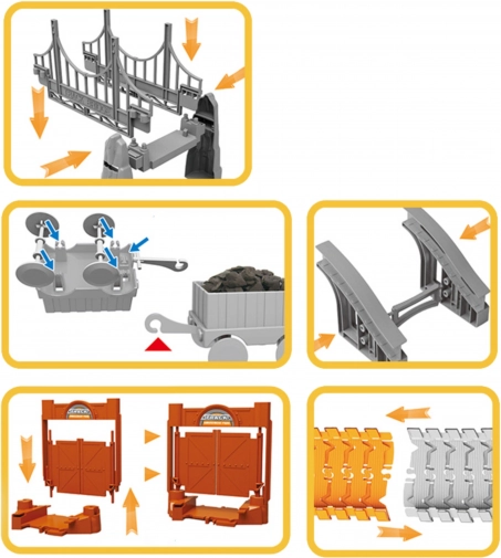 - 150 baandelen, 14 brugdelen, aangedreven locomotief, wagon, kiepwagen, betonmixer, graafmachine, poort, 4 verkeersborden, 2 vlaggen, verkeerslicht, tankstation, 2 palmen, boompje, set stickers
