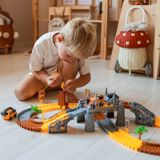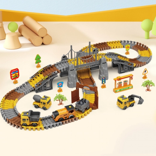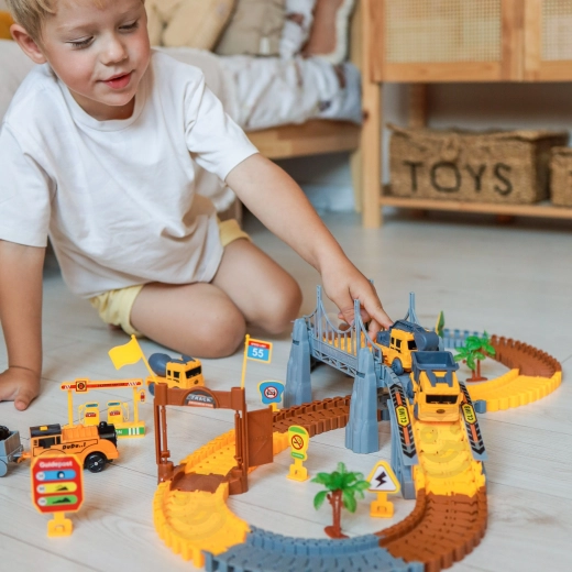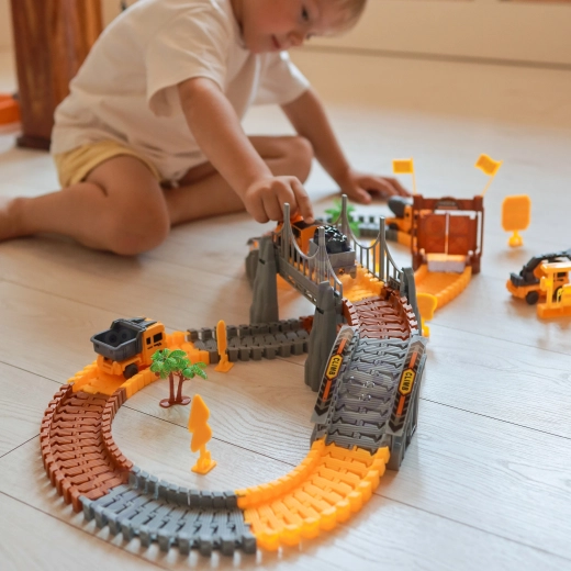 Deze grote constructieset combineert de wereld van treinen en racebanen in één leuke set. Dankzij de elastische, in elkaar klikbare onderdelen maakt je kind eenvoudig rechte stukken, bochten, opritten en brugsegmenten. Voor een realistische sfeer zorgen de bouwmachines, poorten, borden en andere decoraties die de verbeelding en zelfstandig spel prikkelen.