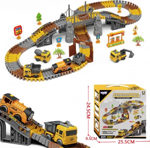 De set omvat een aangedreven locomotief voor het vervoeren van “lading”, kleine voertuigen voor het werk op de bouwplaats en een rijk assortiment accessoires. Monteren is intuïtief en stevig, zodat kinderen de baan steeds opnieuw kunnen ombouwen en nieuwe varianten kunnen uitproberen. Batterijen zijn inbegrepen, dus het spel kan meteen beginnen.