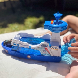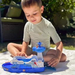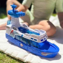 De boot is gemaakt van hoogwaardige, duurzame materialen, heeft frictie-aandrijving (rijdt na een duwtje) en rijke details, waaronder openende dekken, een achterramp en zijdeuren. De set bevat 3 metalen politieautootjes die via de ramp kunnen worden geladen om spannende scènes te creëren. Let op: de boot drijft niet – bedoeld voor spel op het droge.