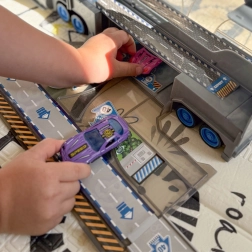De truck werkt als rijdende transporter en als draagbare koffer voor autootjes en accessoires. Kinderen nemen zo de hele set gemakkelijk overal mee naartoe.