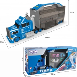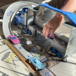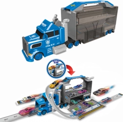 De grote politietruck van WOOPIE verandert in een oogwenk van een transportset voor autootjes in een complete raceset met garage en baan. Na het openen van de trailer verschijnt een interne speelzone met rampen, loopings en borden, waar kinderen spannende races en duels kunnen organiseren.