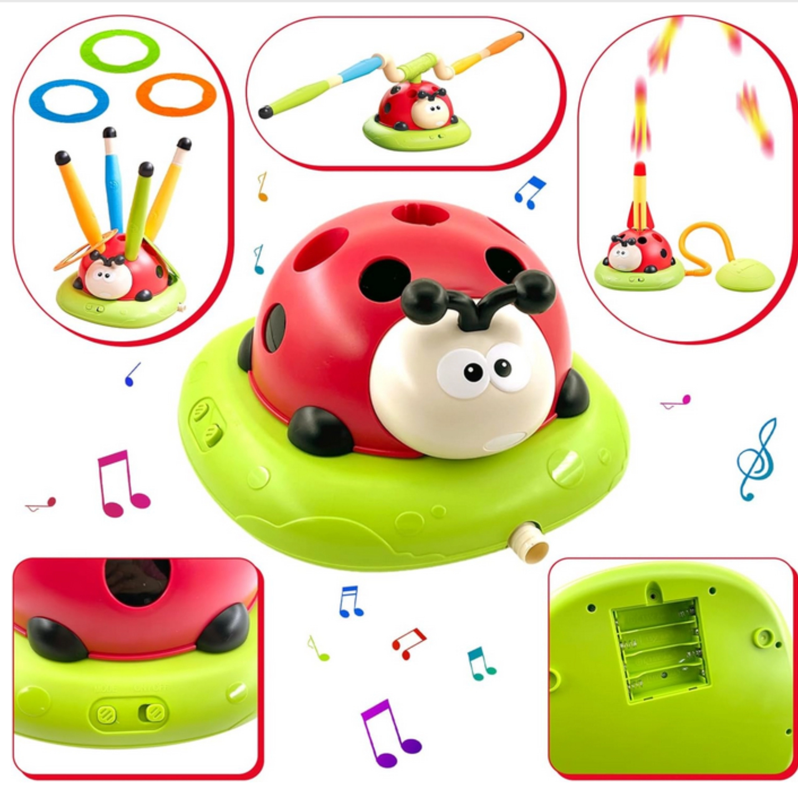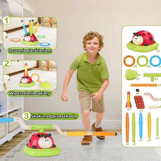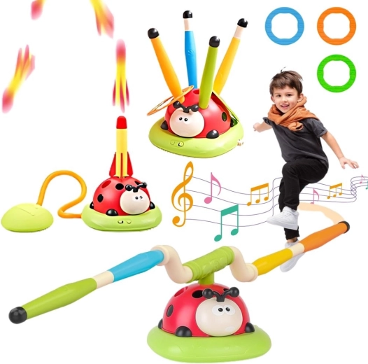 Met deze kleurrijke “lieveheersbees” oefenen kinderen hun behendigheid en beleven ze veel beweging. 3 activiteiten in 1 betekenen het einde van verveling: over een draaiende stang springen, een zachte raket afschieten door op de pomp te stappen en ringen op doelen werpen. Het spel is geschikt vanaf 3 jaar, is duurzaam en veilig en motiveert tot actief spelen in de tuin, op de speelplaats en in de woonkamer.