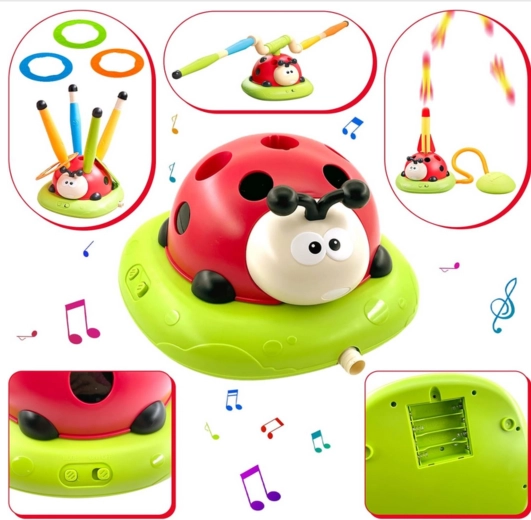 Ideaal voor feestjes, picknicks en familie-middagen. Voeding van de interactieve functies: 4× AA (niet inbegrepen). In de doos: de lieveheersbees, 12 gekleurde ringen, raket met pomp, onderdelen van de springstang en een afstandsbediening.