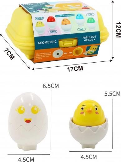 Elk eitje bestaat uit twee delen: een bovenste en een onderste schaal die verbonden is met het kuikenfiguurtje. Kinderen moeten niet alleen de juiste eierdop kiezen, maar vooral het eitje op de juiste plek in de vorm plaatsen. Aan de onderkant heeft elk eitje een uniek geometrisch patroon dat past in één opening van de doos. De grappige gezichten zijn een geweldige manier om kinderen emoties te leren herkennen en benoemen.