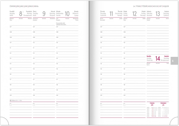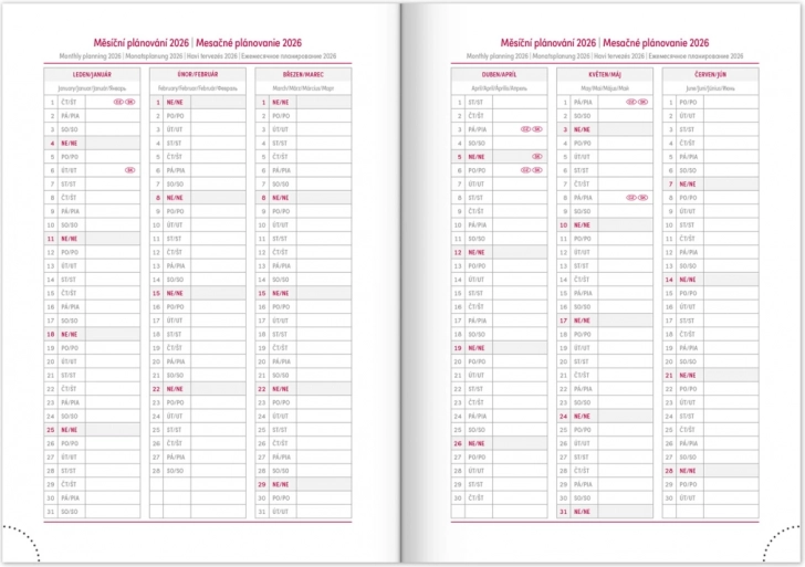 Deze agenda biedt een kwalitatief zwart oppervlak dat maximale bescherming tegen schade biedt. Bevat een Tsjechisch-Slowaakse kalender met extra talen zoals Engels, Duits, Hongaars en Russisch.