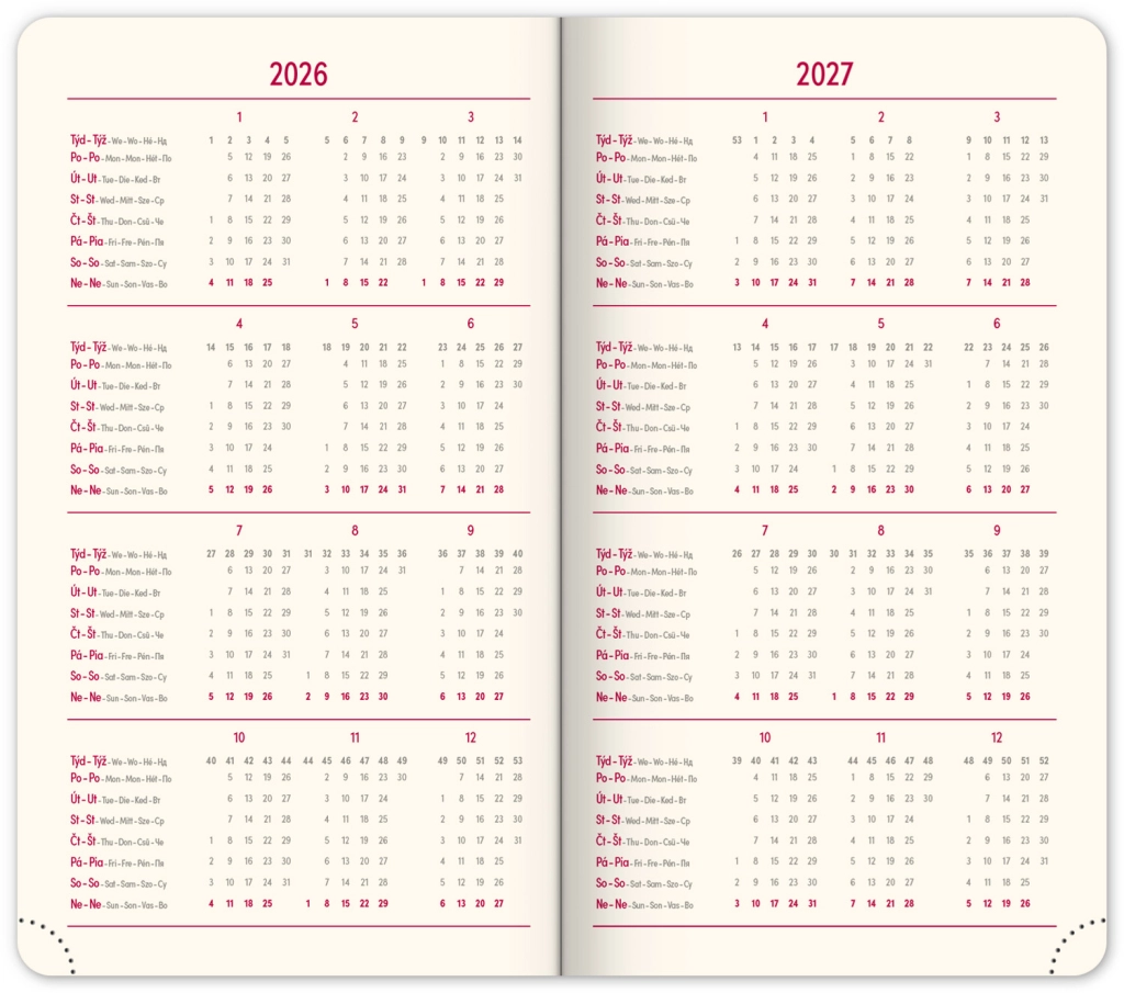 Ontdek de nieuwe reeks agenda’s Essenza, die niet alleen betaalbaar is, maar ook milieuvriendelijk dankzij de omslag van ecologisch papier. Deze agenda biedt een wekelijkse indeling met een Tsjechisch-Slowaakse kalender en aanvullende talen waaronder Engels, Duits, Hongaars en Russisch.
