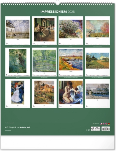 Wandkalender Impressionisme 2026 met schilderijen van beroemde kunstenaars Degas, Cézanne en Renoir. Afmeting 48 x 56 cm.