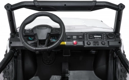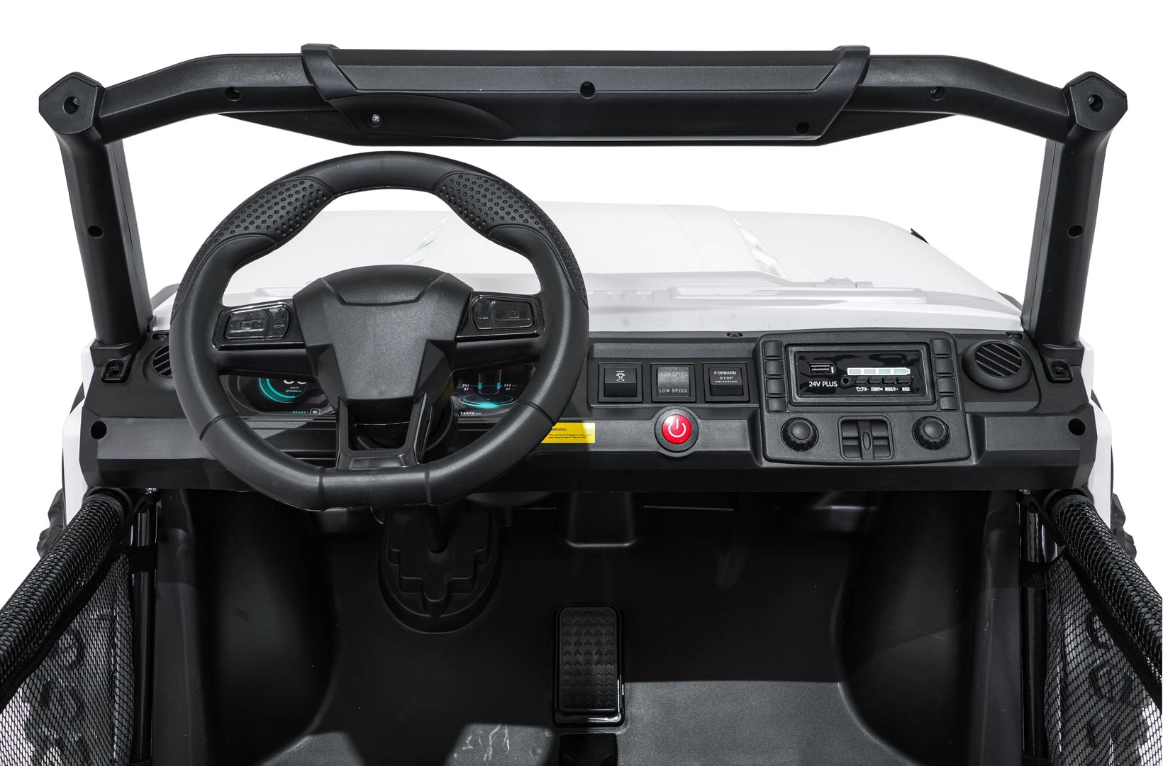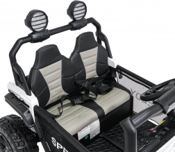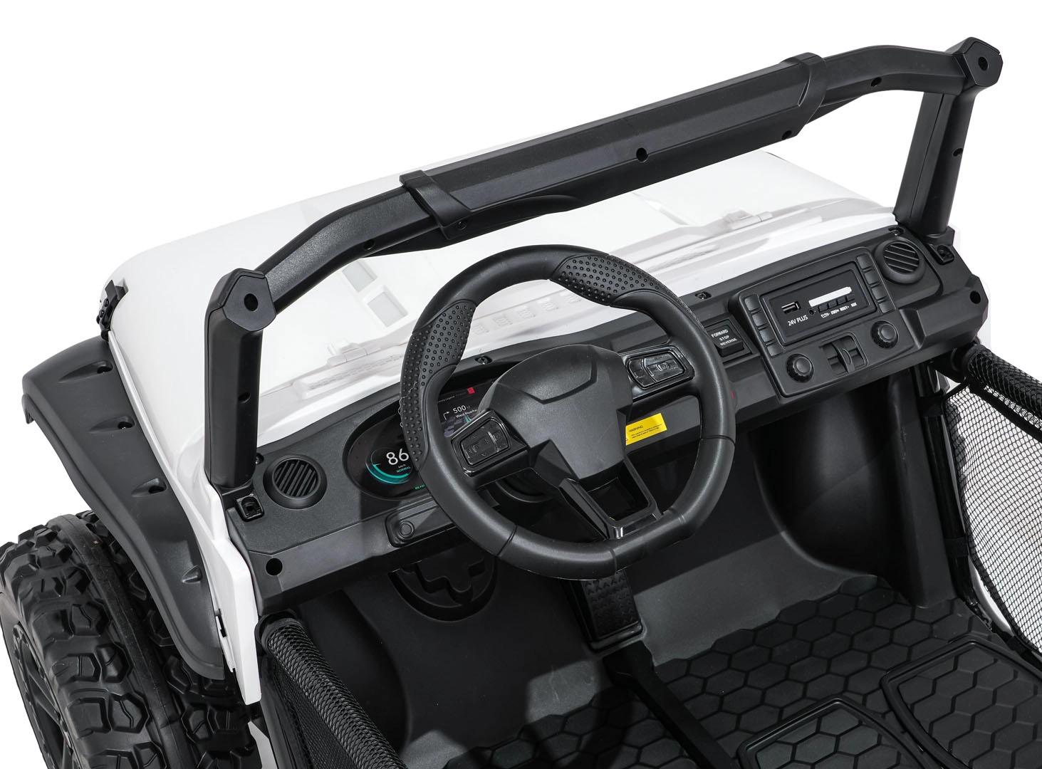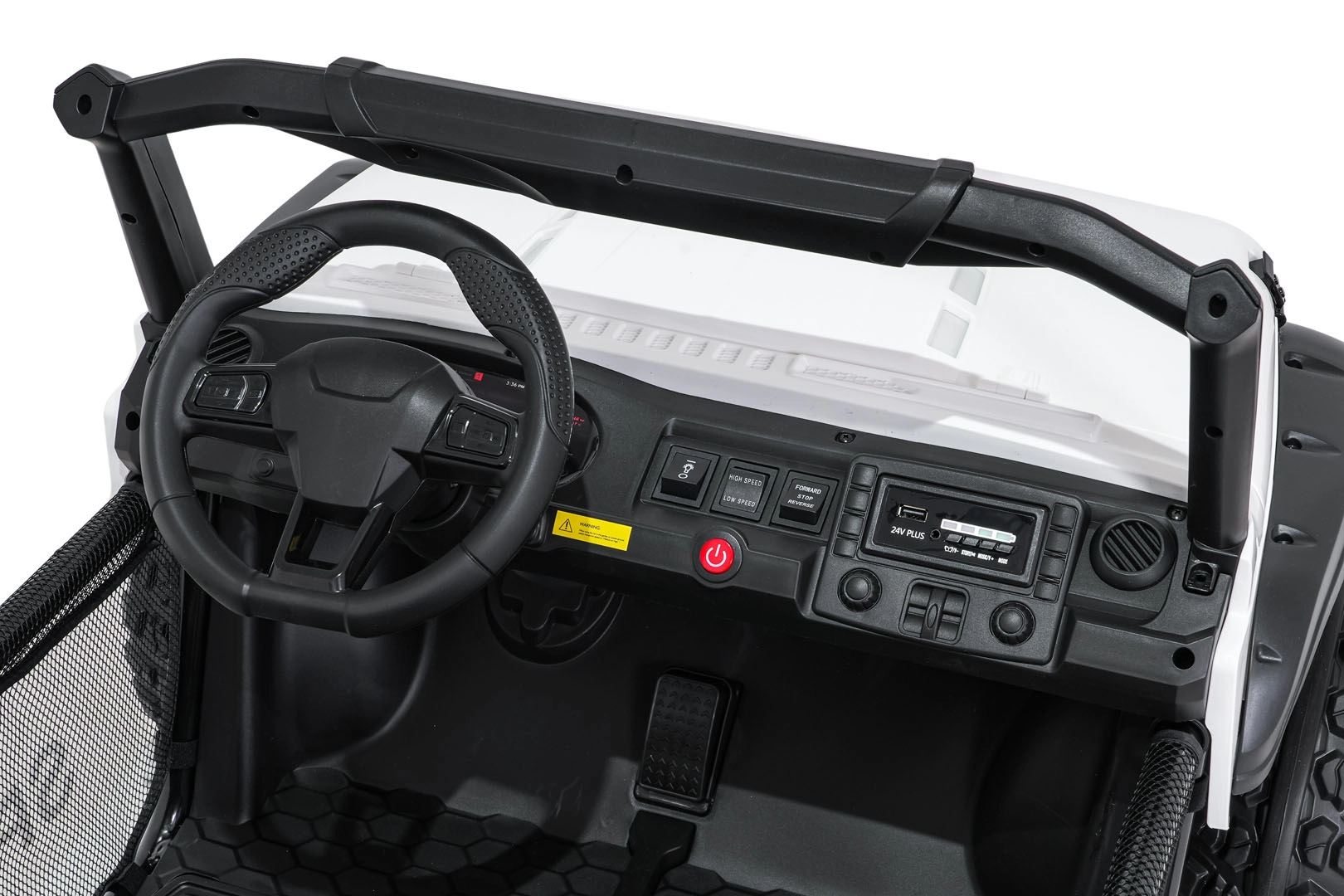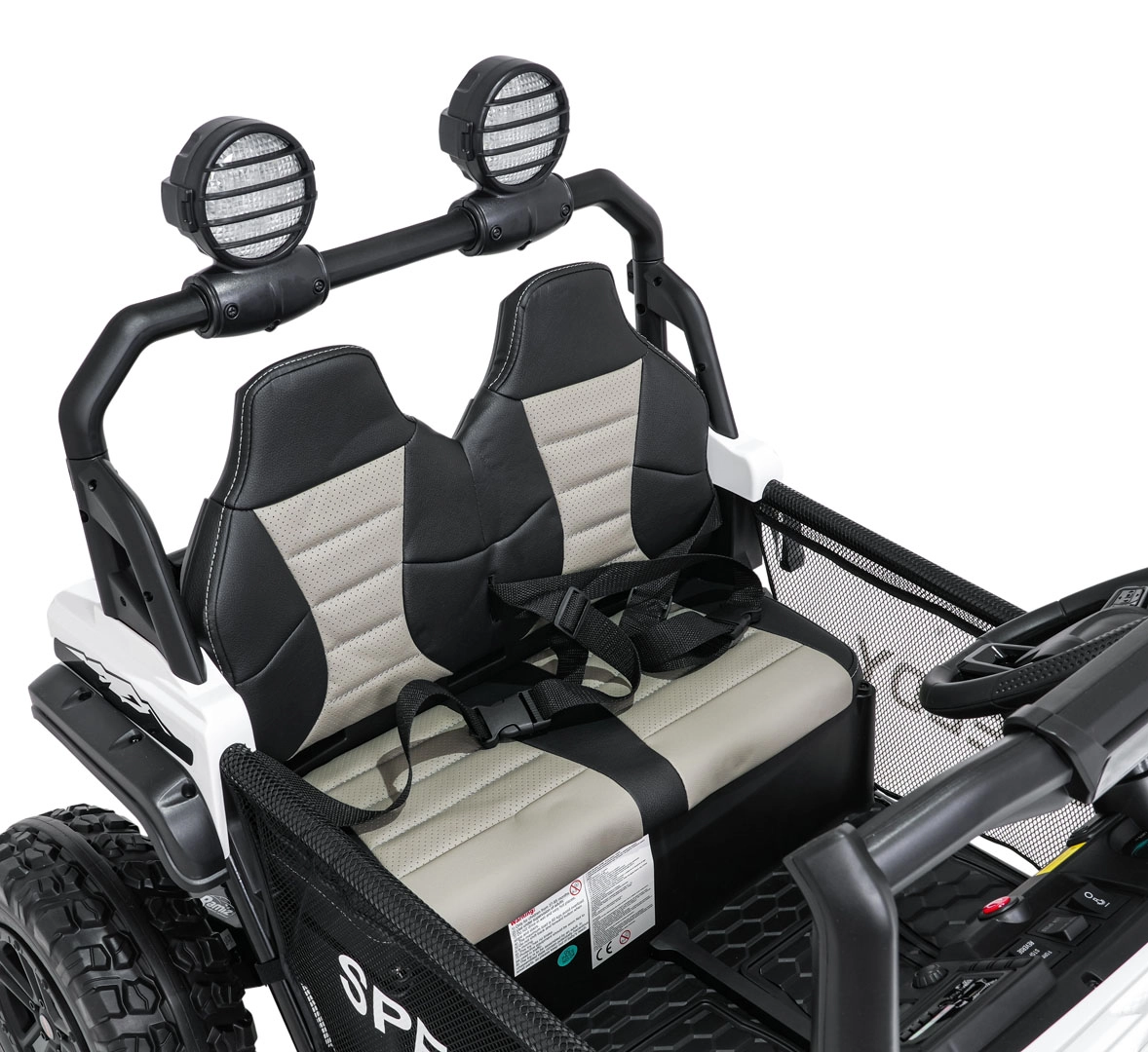 Jonge bestuurders genieten van de rijke uitrusting: multimediapaneel met MP3/USB/AUX en Bluetooth, geluiden en claxon op het stuur, LED-koplampen en verlichte motorkap. Ouders waarderen de 2,4 GHz afstandsbediening met 3 snelheden, soft start en noodstop. De tweepersoons eco-leren stoel met gordels verhoogt comfort en veiligheid.